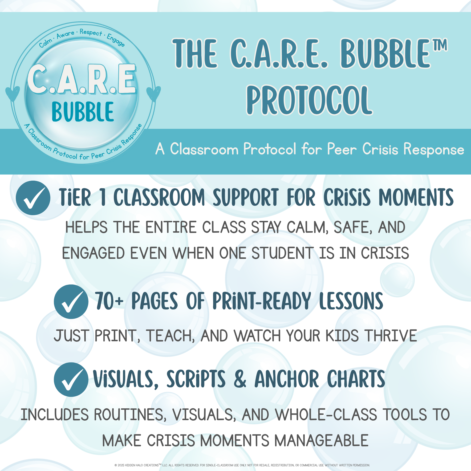 The C.A.R.E. Bubble™ Protocol is a Tier 1 behavior support system for PreK–2 that equips teachers with everything they need: a full teacher guide, six student lessons, a complete bubble drill, anchor charts, vocabulary cards, draw-and-write pages, an incentive chart, a parent letter, a completion certificate, and a teacher Q&A.
